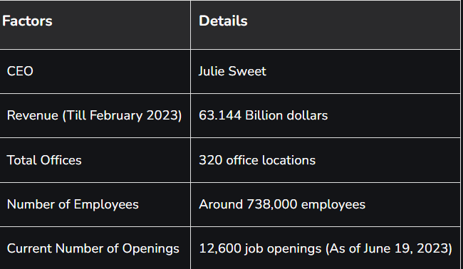 Accenture-ийн орлого 2023 оны 2-р сар хүртэл 12 сарын хугацаанд бараг 63 тэрбум доллар болсон нь өмнөх оныхоос 11.38%-иар өссөн байна. Түүгээр ч зогсохгүй энэхүү мэдээллийн технологийн компани нь янз бүрийн салбар дахь үйлчлүүлэгчдийн хувьсан өөрчлөгдөж буй хэрэгцээг хангахын тулд олон төрлийн, дасан зохицох боломжтой үйлчилгээг санал болгодог. Тиймээс Accenture-ийн дэлхий дахинд оршихуй, хүчтэй нэр хүнд, инновацид төвлөрч, олон талын туршлага, үйлчлүүлэгч төвтэй арга барил нь дэлхий даяар нэр хүндэд нь хувь нэмэр оруулдаг.