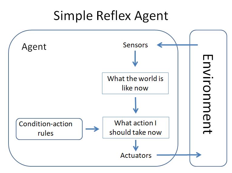 Энгийн рефлексийн агентууд:   Зөвхөн одоогийн орчны тусгалын үндсэн дээр ажилладаг бөгөөд хүний биеийн рефлексийн үйлдэлтэй төстэй ажилладаг. Тухайлбал галын дөлөнд хүрэхэд хүн хуруугаа даруй татдаг. Тухайн нөхцөл байдалд үндэслэн хүний бие махбод цаг алдалгүй хариу арга хэмжээ авдаг шиг агент мөн тухайн орчны өнгөрсөн төлөв байдлаас үл хамааран тухайн орчиндоо тулгуурлан хариу өгдөг. Шийдвэр гаргахдаа тухайн үеийн ойлголт дээр үндэслэсэн тохиолдолд л рефлексийн агент зөв ажиллаж чадна.