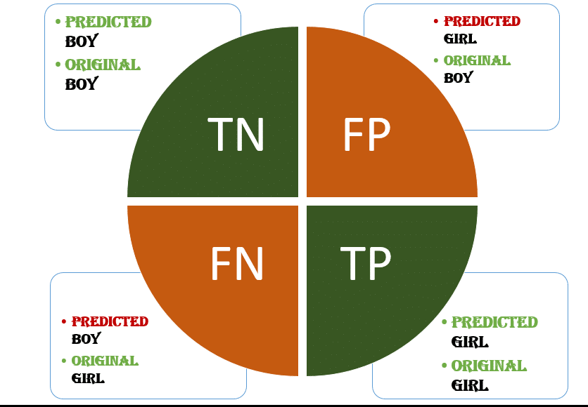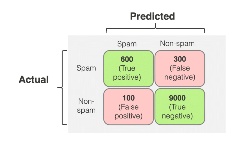 Эдгээр ойлголтыг илүү сайн ойлгохын тулд confusion matrix гэсэн суурь ойлголтыг мэдэх хэрэгтэй байдаг. Confusion matrix нь model-ийн үр дүнг дөрвөн төрөлд хувааж харуулдаг.
