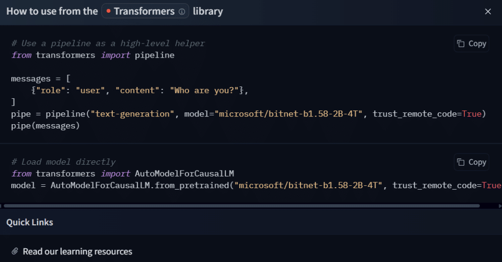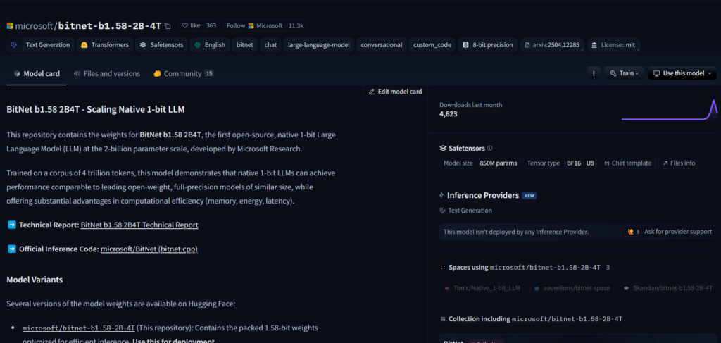 Дээрх зурагт харуулснаар Microsoft/bitnet-b1.58-2B-4T нэртэй загварыг онцолж авч үзэхэд model card буюу загварыг тухай мэдээллийг агуулсан хуудас руу шилжинэ. Энд тухайн загварын нарийн мэдээлэл, ашиглагдсан тоо хэмжээ, гэх мэт бусад мэдээллүүдийг агуулж байна.