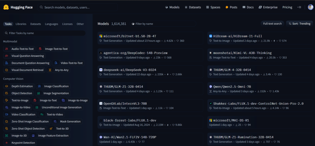 Hugging Face ийн вэб сайтад зочлон ороход дараах байдлаар харагдах ба зөвхөн хиймэл оюуны загваруудаас гадна дараах зүйлс багтаж байна: