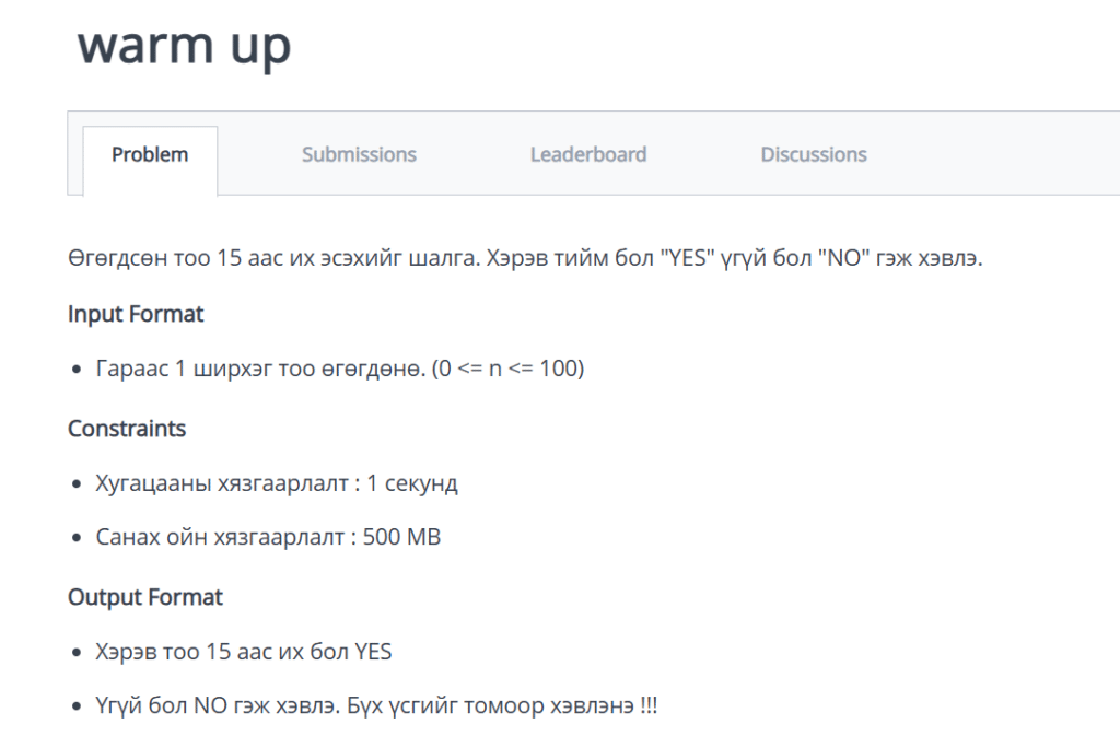 Энэхүү бодлого нь бие халаалтын буюу энгийн логиктой бодлого бөгөөд үндсэндээ өгөгдсөн нөхцөлийг шууд хэрэгжүүлэхэд л хангалттай. Тодруулбал, хэрэглэгчээс нэг тоо авах бөгөөд уг тоо 15-аас их байгаа эсэхийг шалгаж, үр дүнг харгалзан тохирох мэдээллийг хэвлэх шаардлагатай.