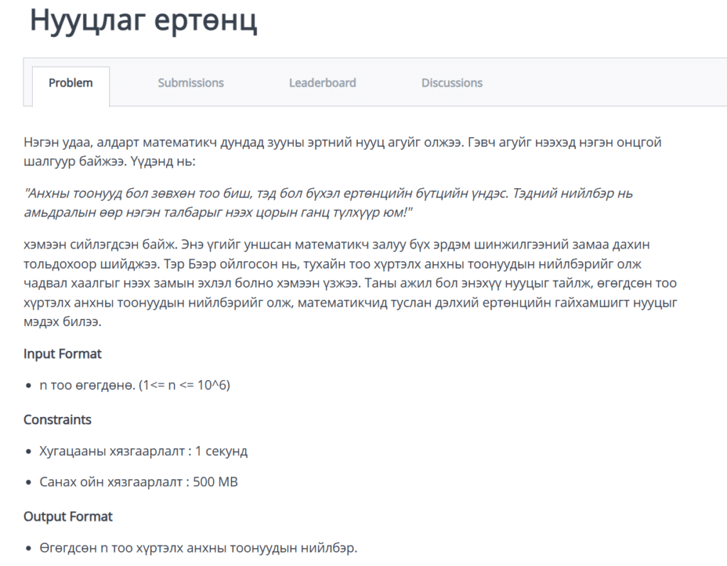 Бодлого бодох явцын хамгийн чухал хэсэг нь өгүүлбэрийг зөв ойлгож унших явдал гэдгийг бид өмнөх нийтлэлүүддээ онцолсон бөгөөд энэхүү бодлогын үндсэн зорилго нь өгөгдсөн тоо хүртэлх бүх анхны тооны нийлбэрийг олох юм. Анхны тоо гэдэг нь зөвхөн 1 болон өөртөө хуваагддаг тоо бөгөөд өгөгдөх тооны хязгаар 1,000,000 хүртэл, хугацааны хязгаар 1 секунд байна. Давхар давталт (O(n²)) ашиглавал өндөр утгатай тоон дээр хэт их хугацаа шаардагдах тул өгөгдсөн хугацаанд бүх тестийг давахад хүндрэлтэй байж магадгүй. Тиймээс хугацааг багасгахын тулд бид тухайн тооны язгуур хүртэл л шалгах бөгөөд энэ нь ямар ч тооны хуваагч нь түүний язгуурын утгаас бага байдаг гэсэн математикийн үндсэн зарчимд тулгуурласан учир илүү оновчтой шийдэл болно.