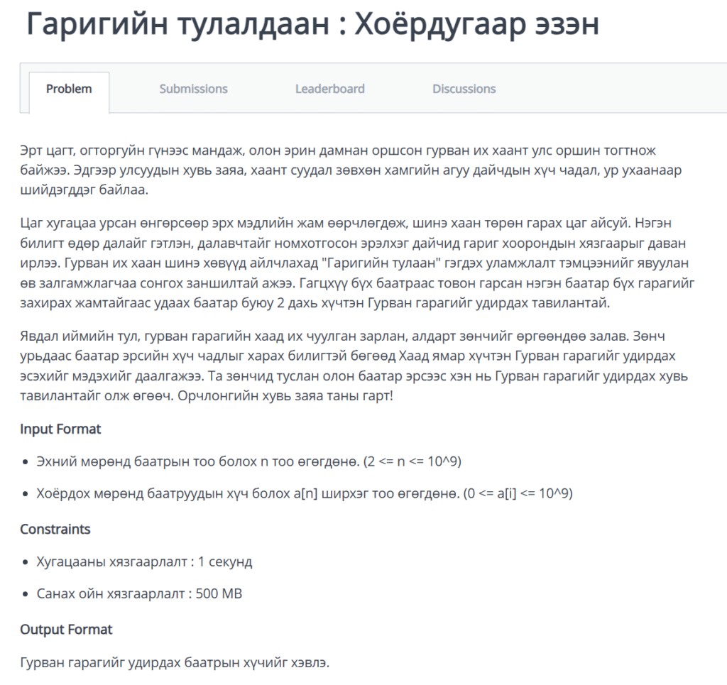 Энэхүү бодлогын хувьд толгой эргүүлсэн төвөгтэй өгүүлбэртэй ба энэ нь competitive programming -ийн нэг хэсэг билээ. Учир нь бид тухайн асуудлаас хамгийн гол хэсгийг ялгаж харах чадвартай байх хэрэгтэй. Бодлогын гол агуулга нь баатруудын хүч өгөгдөхөд 2 дохь хүчтэнийг олох юм. Энгийнээр бидэнд n тоо өгөгдөх ба дараа нь n ширхэг хүч өгөгдөнө. Ингээд бид энэхүү дарааллаас 2 дохь хамгийн их тоог олон түүний утгыг хэвлэхэд хангалттай.