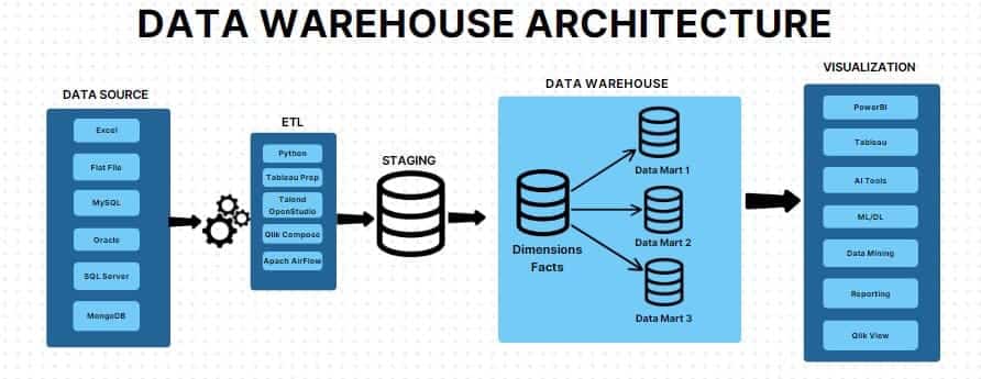 Энэ нь байгууллагуудад их хэмжээний өгөгдлийг хадгалах, удирдах, дүн шинжилгээ хийх боломжийг олгох үүднээс өгөгдлийн урсгал, боловсруулалтыг зохион байгуулалттай зохион байгуулдаг бүтэц юм. Өгөгдсөн зурган дээрх архитектур нь мэдээллийн агуулахын орчинд өгөгдөл боловсруулах нийтлэг үе шатуудыг харуулж, янз бүрийн өгөгдлийн эх үүсвэрийг нэгтгэх, ETL (Extract, Transform, Load) процессуудыг ашиглах, бизнесийн оюун ухаан, шийдвэр гаргахад зориулсан өгөгдлийг дүрслэн харуулах боломжийг олгодог.