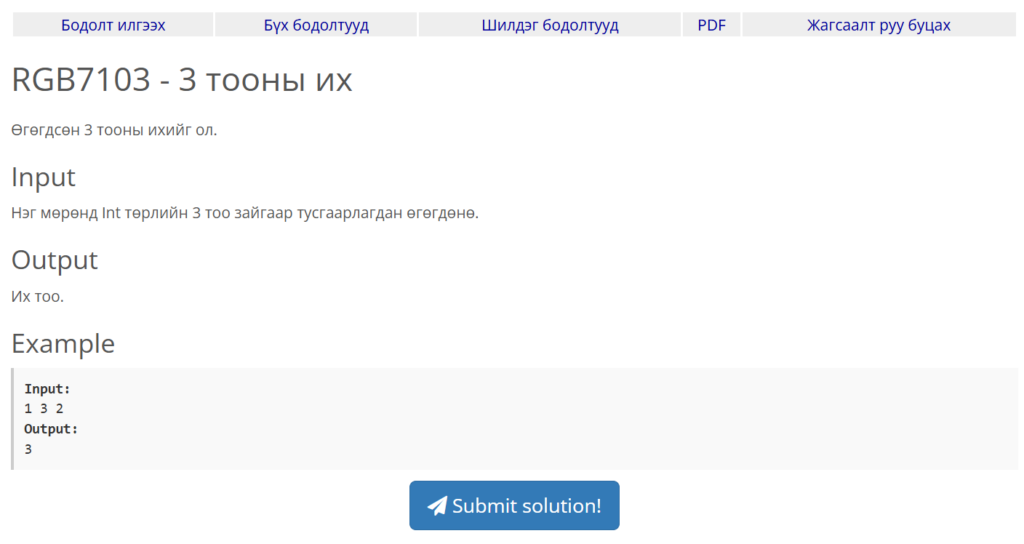 Бидний сонгож авсан жишээ бодлого бол SPOJ RGB7 сайтын “3 тооны их” нэртэй бодлого юм. Энэхүү бодлогын хувьд гараас өгөгдсөн 3 тооны ихийг олон хэвлэхэд л хангалттай ба өөрөөр хэлбэл маш энгийн бодлого билээ. Гэхдээ анхан шатны суралцагчид маань гараас 3 тоогоо авч чадахгүй дараах нийтлэг алдааг гаргах тохиолдол олон байдаг.