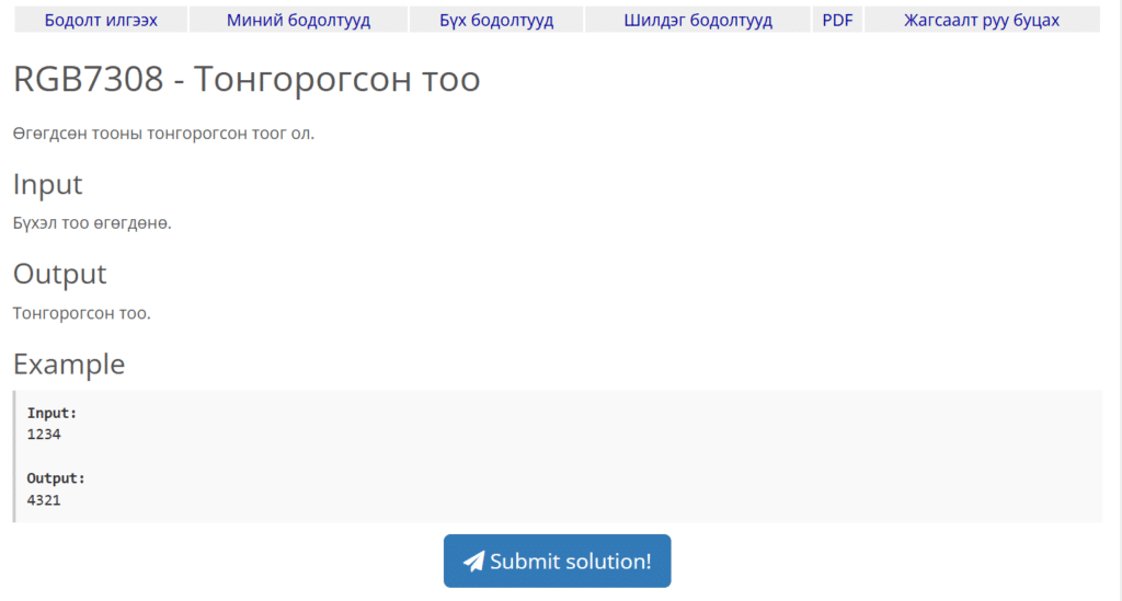 Энэ удаад сонгож авсан бодлого маань энгийн хэрэгжүүлэлтийн (implementation) ийн бодлого ч гэсэндээ бидэнд хэд хэдэн чухал зүйлсийг ойлгуулах болно. Өмнө үзсэнчлэн эхлээд бид бодлогын өгүүлбэрийн сайтар уншиж ойлгох хэрэгтэй. Бид өгөгдсөн бүхэл (integer) тоог тонгорох буюу хөрвүүлэн хэвлэх ёстой байх нь.