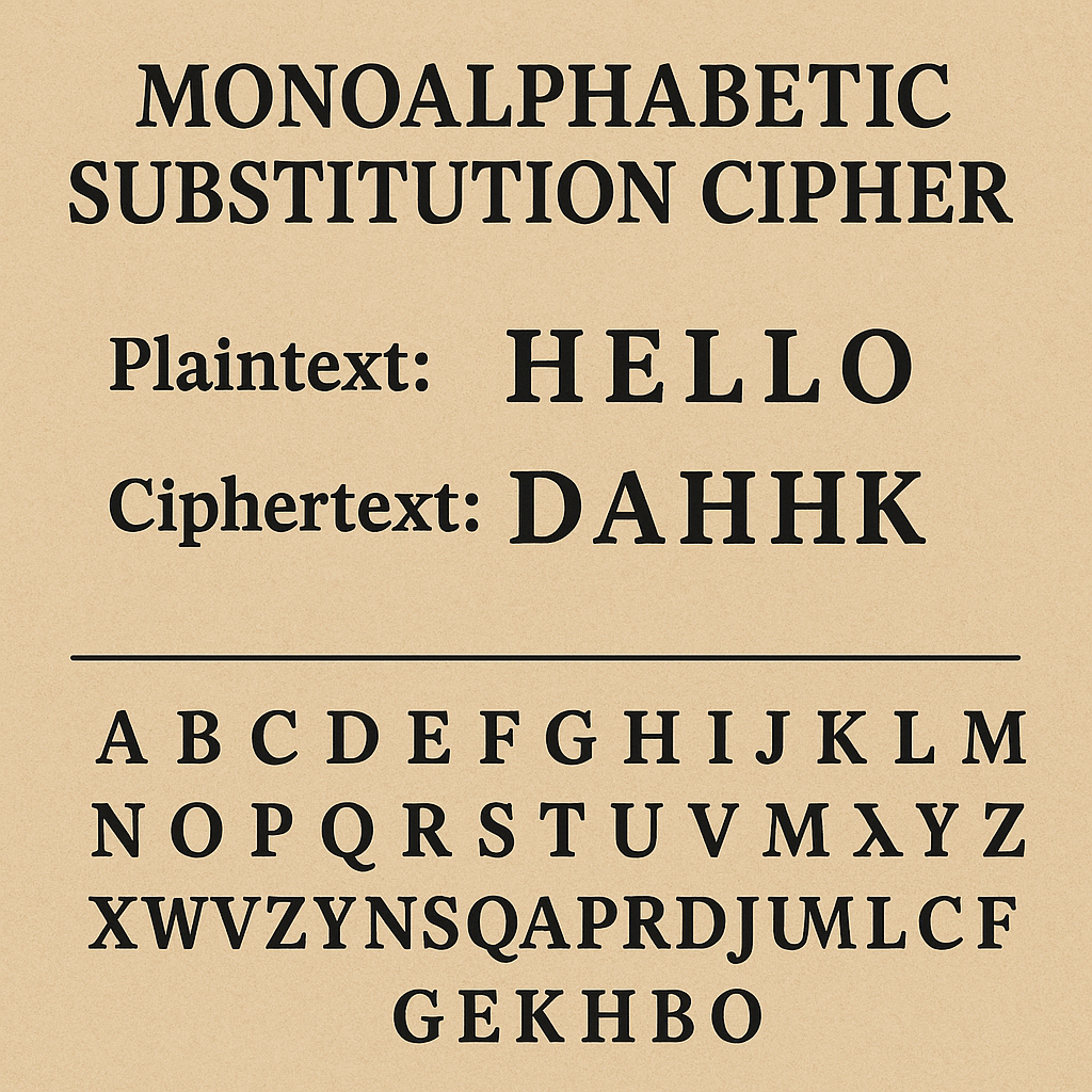 Бидний бүтээсэн хүснэгтээр “H” гэсэн үсгийг “T” гэж солилцсон. Бүх үсгүүд ижил зарчмаар солигдсон тул “HELLO WORLD” бол “TQXXA IADXP” болж хувирна. Monoalphabetic Substitution Cipher нь маш энгийн боловч, шифрийг тайлбарлахдаа зөвхөн хүснэгтээр үндэслэсэн байдаг. Хэрэв хүсвэл шинэ хүснэгт бүтээж, шифрийн үр дүнг өөрчилж болно.