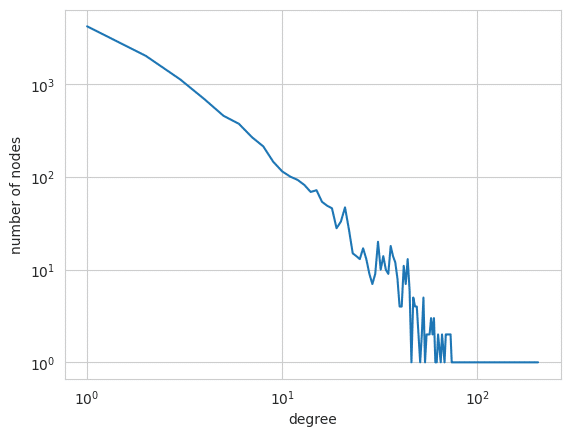import numpy dd = sorted(nk.centrality.DegreeCentrality(G).run().scores(), reverse=True) degrees, numberOfNodes = numpy.unique(dd, return_counts=True) plt.xscale("log") plt.xlabel("degree") plt.yscale("log") plt.ylabel("number of nodes") plt.plot(degrees, numberOfNodes) plt.show()