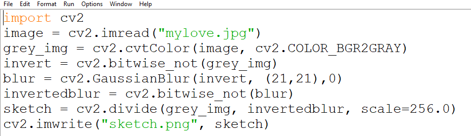 image = cv2.imread(“энд зурагны нэрээ оруулна.jpg”) гэж нэрийг нь image хувьсагчтай мөрөнд өөрчлөлт оруулна. Эцэст нь кодоо IDLE-ийнхаа run дээр дараад эсвэл F5 дээр дараад кодоо ажиллуулна. Тэгээл шинээр sketch нэртэй зурган файл үүссэнээр манай зураг бэлэн боллоо.
