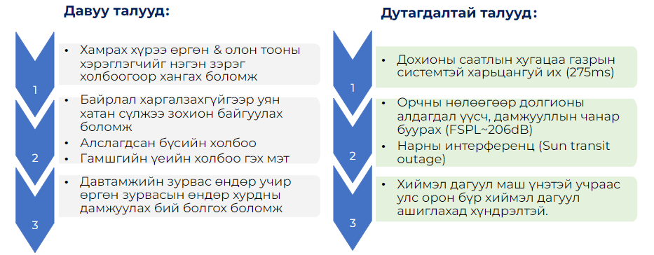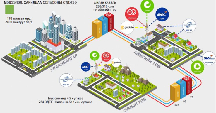 • Шилэн кабелийн үндсэн сүлжээний дамжуулал ашиглах боломжгүй газруудад радио релей болон сансрын холбоогоор шийддэг.